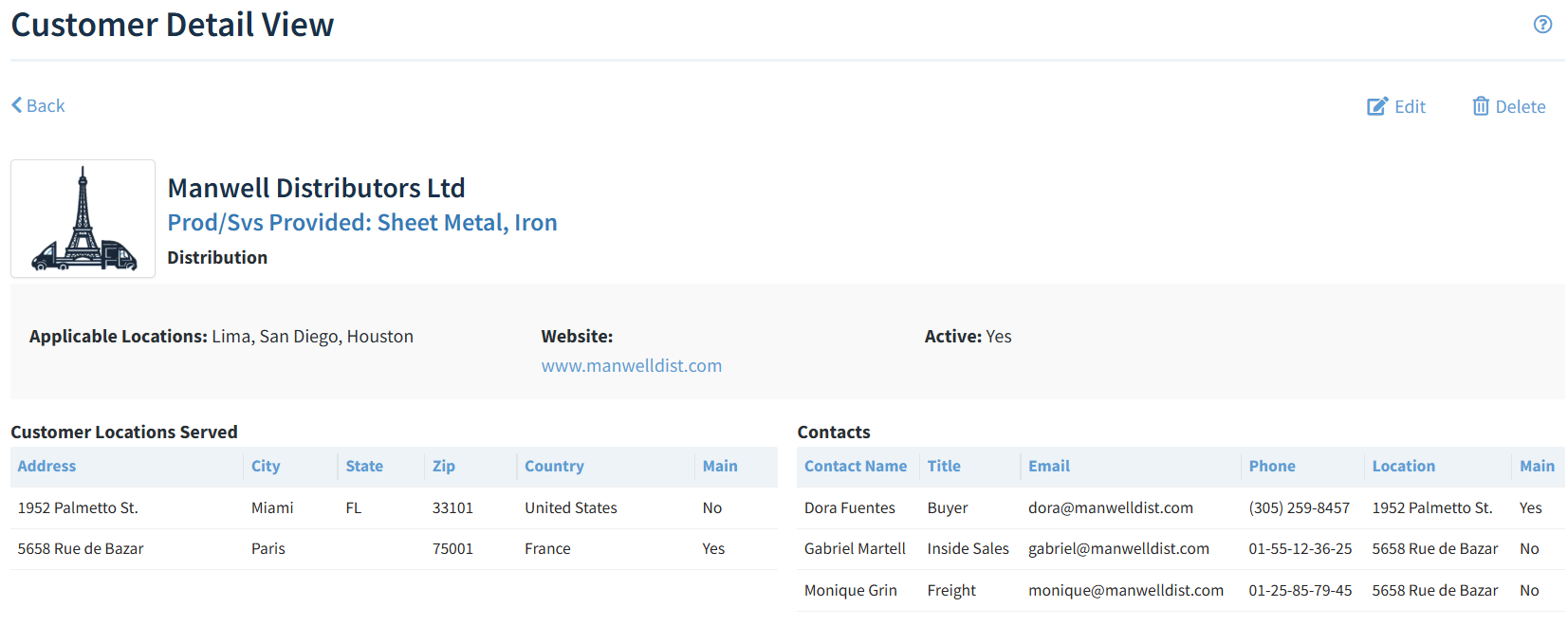 You can store detailed information for each customer, including company name, services provided, website, logo, and multiple physical locations. For each contact, you can capture their name, title, email, phone number, location assignment, and designate whether they are the main contact.