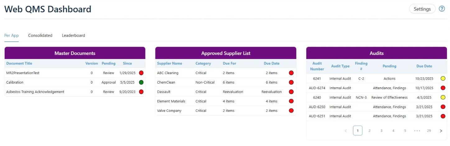 From one page, users can jump directly into deeper workflow modules without navigating menus, thus providing centralized access to all Web QMS apps.