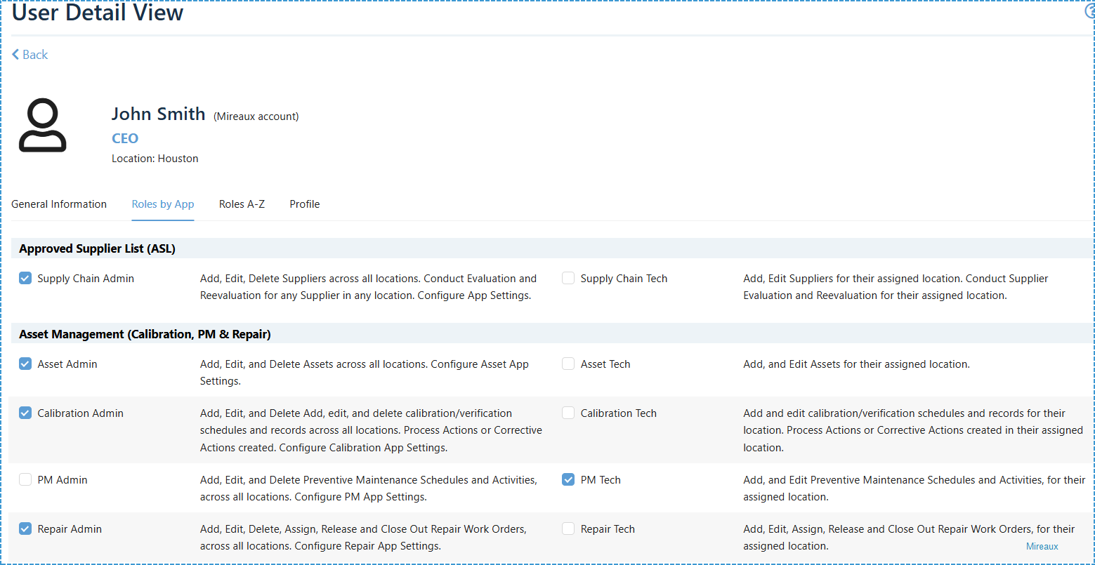You can assign roles by application (Admin or Tech), as well as global roles such as Administrator or Employee. Each role includes a description of its permissions, ensuring clear and accurate assignments.