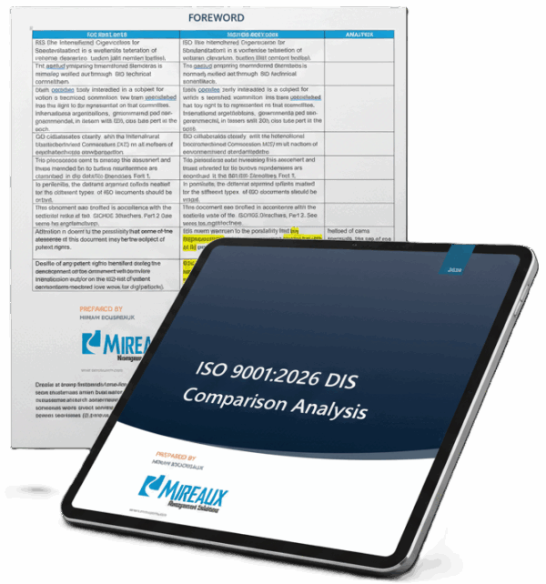 A complete side-by-side comparison of the full ISO 9001:2026 Draft International Standard (DIS) and ISO 9001:2015 including highlighted wording changes, identified new requirements, structural refinements, requirement-level changes and expert commentary.